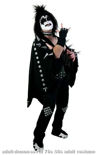 JumpsuitWings/CapeChokerWigBeltGlovesBoot CoversAre you ready to rock? The Demon costume consists of a black, sleeveless, polyester jumpsuit that velcros in the back for closure and features a “v” shaped neckline. The black wings/cape velcros onto the shoulders and is also secured to the arm with two straps. It is embellished with silver, plush spikes along the edge and screenprinted studs that are grey and lined in white on the back. A black belt with the same screenprinted studs velcros around the waist. A black choker with screenprinted black, grey and white accents velcros around the neck. Black, fingerless gloves with silver, plush spikes and matching boot covers are also included. The boot covers feature the same screenprinted grey, black and white accents as well as silver trim around the toes. The boot covers are secured with elastic. The black wig features Gene Simmons’ signature style with a small ponytail on top and is lined with mesh on the interior. Become a legendary rock star when you add any of our KISS makeup!