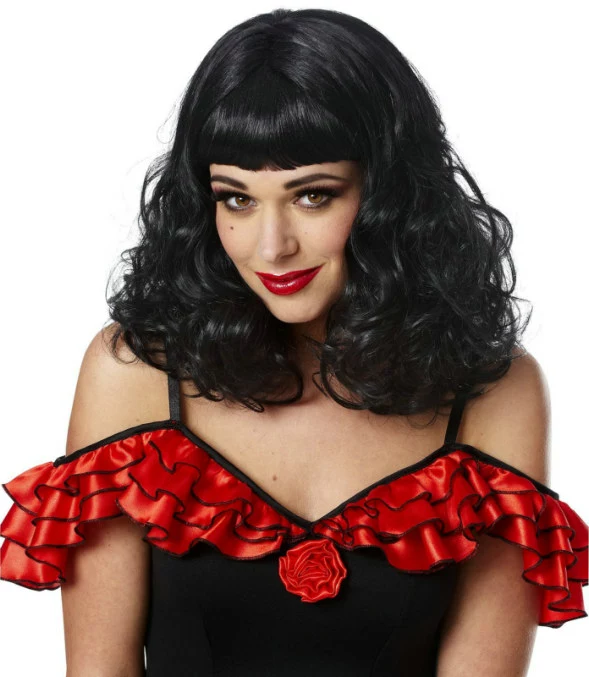 What happens in Vegas may stay there, but this wig will go with you anywhere, Vegas or not. Features a shoulder length, black wavy haired wig with straight bangs. Pair with any of our costumes for an extra little extra something.