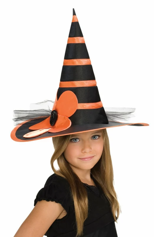 Your little witch will cast spells that are hazy when she plops on this hat with an orange daisy. Your darling witch will look define in this black witch hat with orange horizontal stripes, black mesh bow in the back and large matching orange daisy flower on the side.