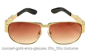 SunglassesHop on stage this Halloween in these concert gold Elvis glasses. These sunglasses have brown-tint lens that are large and round. The gold frame is thin around the lens and thicker over the nose. The thick sides are decorated with the brand name, TCB, in silver. A protective case is also included. Add any of our Elvis Presley costumes to make the girls swoon all night long.