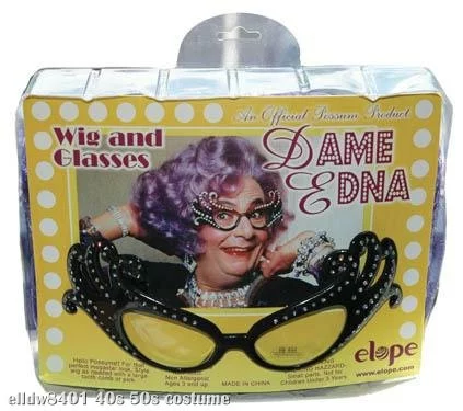 Dame EdnaOfficially licensed wig and glasses set. Wig is the same color and style that Dame Edna herself wears during the show. Glasses are made in the same style as Dame Edna’s stage glasses and they are adorned with iridescent glitter to really give the affect of rhinestones under stage lights. Added Bonus! Glasses are 100% UV Protection (UV 400) and impact resistant. This is an officially licensed Dame Edna product. Available size: