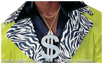Silver Dollar Sign NecklaceMake sure your pimp costume gets noticed with this jewelry! It consists of a sparkling, silver dollar sign charm attached to a faux gold chain. The charm measures 3 1/4″ wide and 5″ tall. Every pimp needs bling so get yours with this affordable necklace!