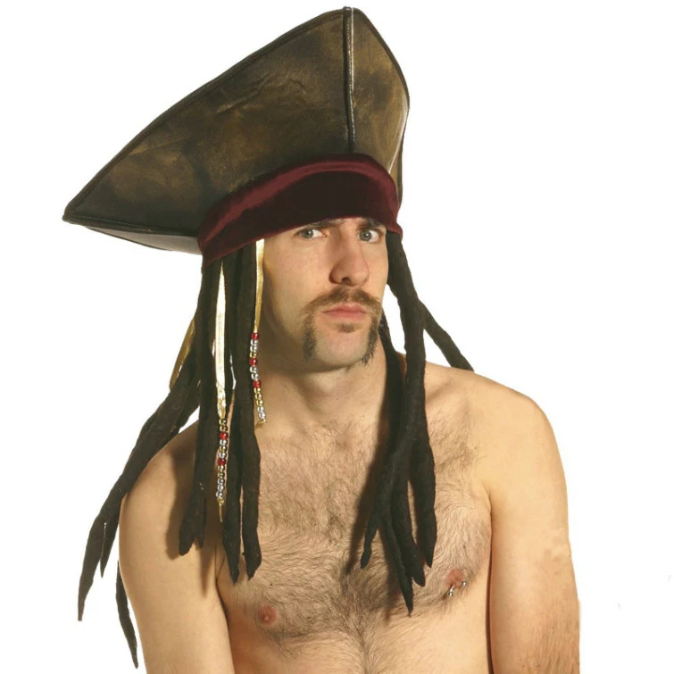 Hit the high seas in style this Halloween. This fabulous pirate hat feature attached black dread locks and beads. Guaranteed to be an excellent finishing touch to your ensemble!