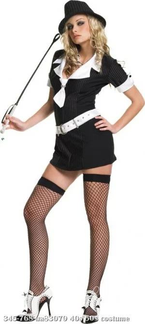 This Honey Will Shoot You DownCostume includes: White lapel, pin striped zipper front mini dress, rhinestone accented belt and clip on tie.Available sizes:
