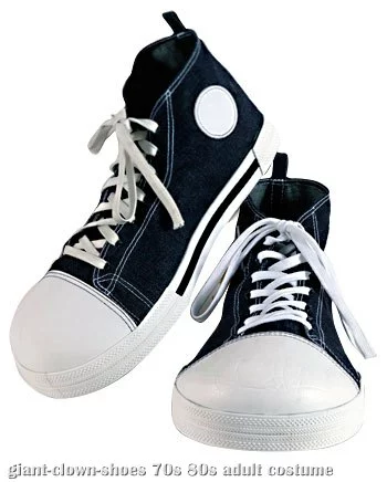 Pair of Giant Clown SneakersYou’ll love clowning around this Halloween season in these giant shoes! The polyester sneakers are blue with the appearance of denim and have white stitching and accents. They lace up the front and tie to secure them in place. Grips on the bottom also provide easy walking and they measure 14″ from heel to toe. Slip these shoes on with any of our funny clown costumes for a complete look.