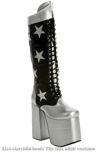 Officially Licensed KISS Starchild BootsHit the stage in these platform Starchild boots from KISS. These KISS boots have a silver vinyl cuff with a silver strip going down the back of the leg to a silver heel piece. The sides of the boots have black vinyl with 5 star cut outs that reveal silver vinyl. The boots have a black lace that goes up the length of the boot and secures on silver hooks. The tongue, toe, heel, and platform of the shoes are also silver. The heel is fully wrapped in vinyl and the sole of the shoe is a textured silver as well. Stand above the crowd in your official KISS Starchild costume and boots. These KISS boots are also the same ones worn on the Alive tour.