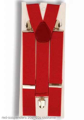 Red suspendersThese suspenders will give various costumes some zing! These red suspenders are made from a 95% polyester 5% polypropylene blend and stretch to fit wide range of sizes. The front of the suspenders feature metal clasps that clamp right into your pants and adjustable straps to allow for even more control over size. The back strap also includes and adjustable strap an pants clamp. Complete you clown costume with this colorful accessory!