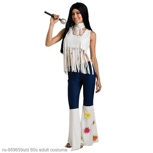 Singing solo or singing with Sonny, you will look like the famous Cher Bono wearing this pop singer adult costume. This Rockstar Gal Adult Costume includes a white crop top with fringe detailing, blue pants with white bell bottoms and colorful flower accents, and a matching white choker with fringe. Pair with the Rockstar Guy Adult Costume (sold separately) for a great Sonny and Cher pop music duo that will be a hit at your next 60s themed costume party.