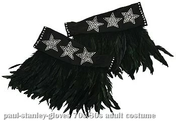 Feathered Arm SleevesBefore you hit the stage in our licensed Authentic Paul Stanley Costume, complete it with these Starchild Feathered Arm Sleeves. These arm sleeves are made of nylon and spandex. They cover the hand up to the elbow and have a slit for the thumb. The top of the sleeves are trimmed in large, shiny rhinestones and three stars embellish the front. These stars are also made from rhinestones in a variety of sizes. The bottom is lined in black feathers that measure up to 10″ in length. When reflected in the light, the feathers have a dark green and blue tint. Don’t forget to add our KISS Starchild Makeup or KISS Starchild Half Mask for the finishing touch to your Paul Stanley costume!