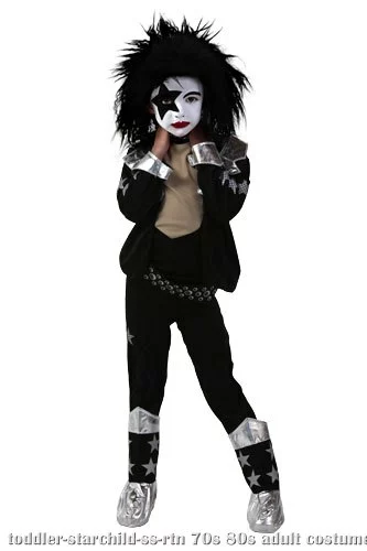 JumpsuitJacketBeltChokerBoot CoversWigMake your toddler the star of the show in this screenprinted Starchild costume! It consists of a black, sleeveless, polyester jumpsuit that velcros in the back for closure. Flesh-colored material covers portions of the chest and torso to represent an open shirt. Silver stars are screenprinted on the legs with three on the front and one on the back. The black jacket also has screenprinted stars on the sleeves and is lined with shiny, silver trim along the cuffs and collar. The black belt and choker have grey, screenprinted studs lined in white. Both pieces are secured with velcro and the jumpsuit has loops for the belt. The boot tops also feature silver screenprinted stars with silver trim lining the cuff and foot. The boot covers are secured in place with elastic. The black wig features Paul Stanley’s signature hairstyle with mesh lining the interior. Get the whole band together when you add our Demon, Spaceman and Catman costumes!